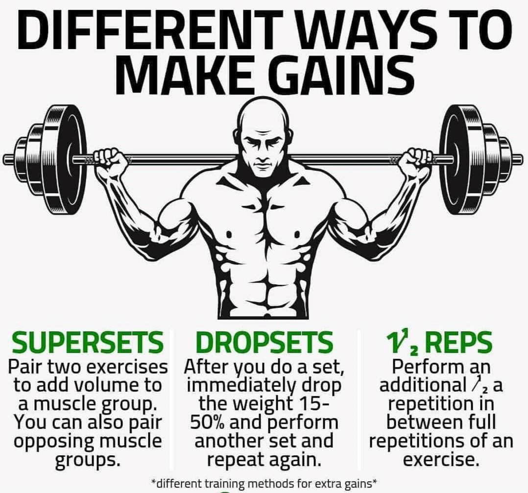 When I train to build muscle and make gains,I use different methods but most commonly I use to focus on the intensity of my training and that really brings my training to next level and to make additional gains and you can also use these technique while being in fatloss cycle also.